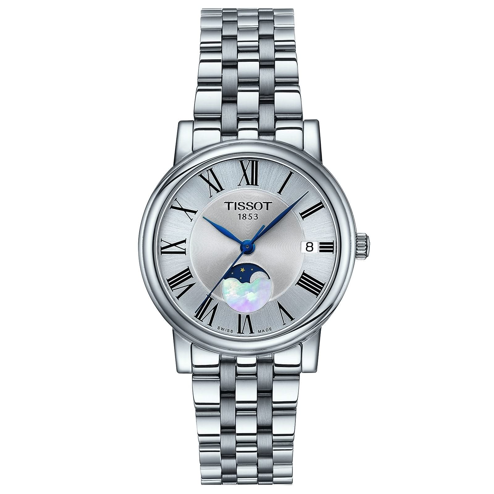 Stainless steel Tissot Carson Premium Lady Moonphase quartz watch. The watch has a silver Roman moonphase date dial with a high polished bezel. The watch case is 32mm and is attached to a stainless steel bracelet.