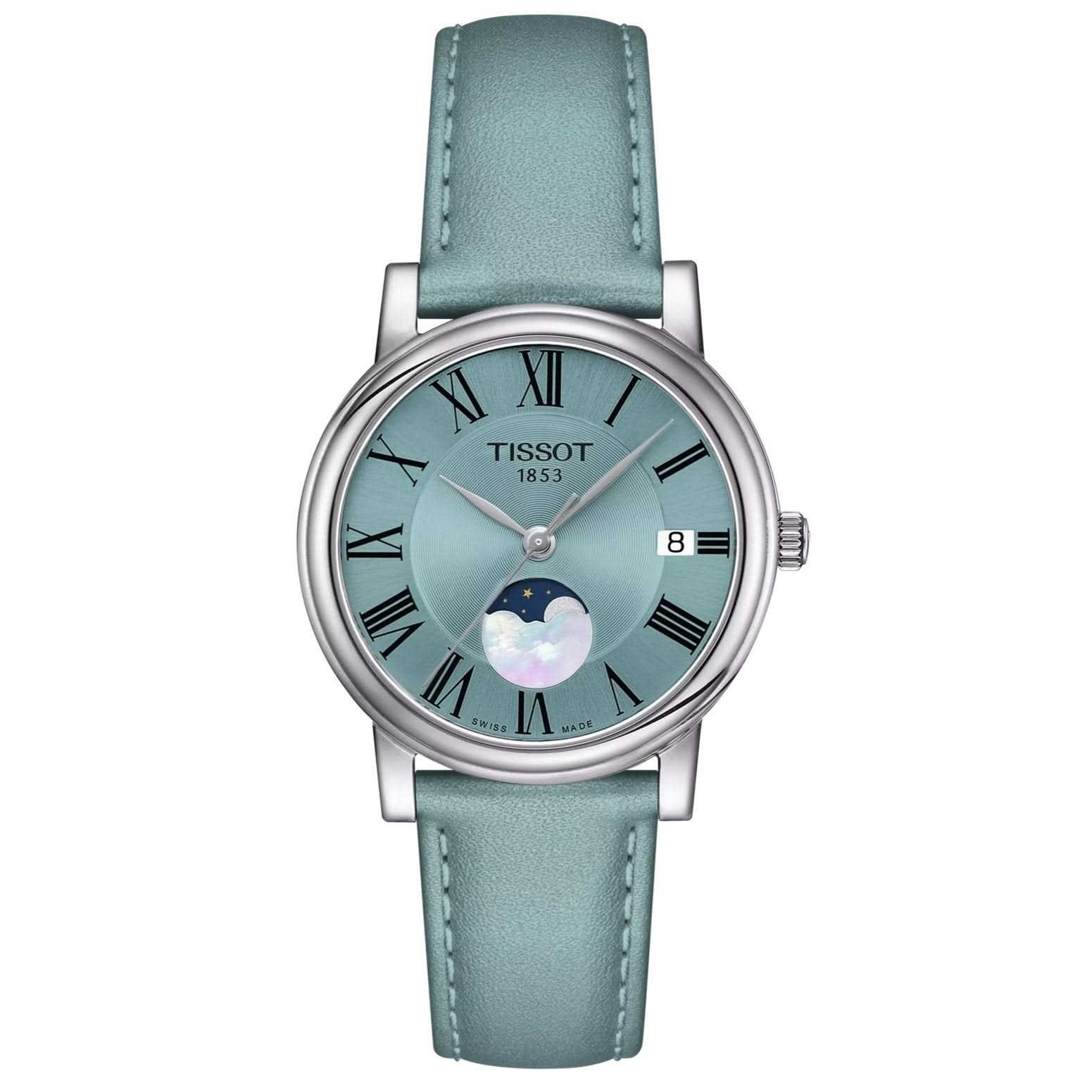 Stainless steel Tissot Carson Premium Lady Moonphase quartz watch featuring a light blue Roman moonphase date dial with a stainless steel bezel. The watch case is 32mm and is attached to a light blue strap.