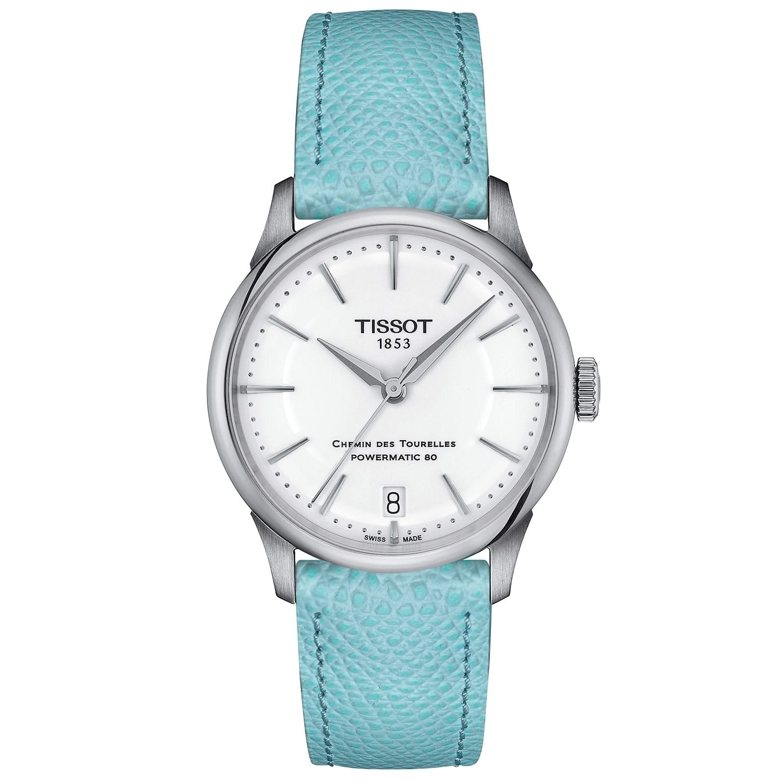 Stainless steel Tissot Chemin Des Tourelles automatic watch featuring a white index date dial with a stainless steel bezel and case. The watch case is 34mm and is attached to a light blue leather strap.