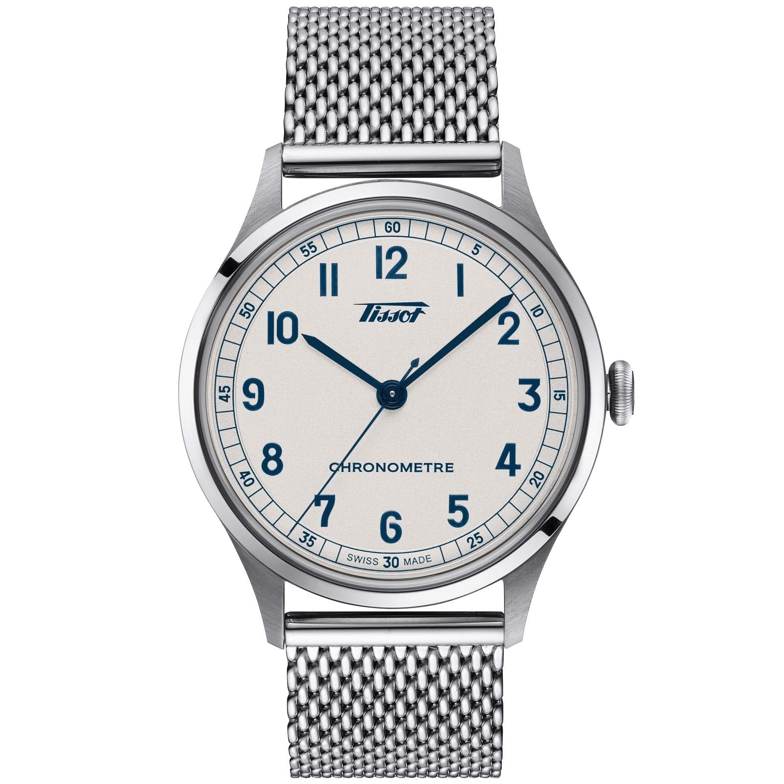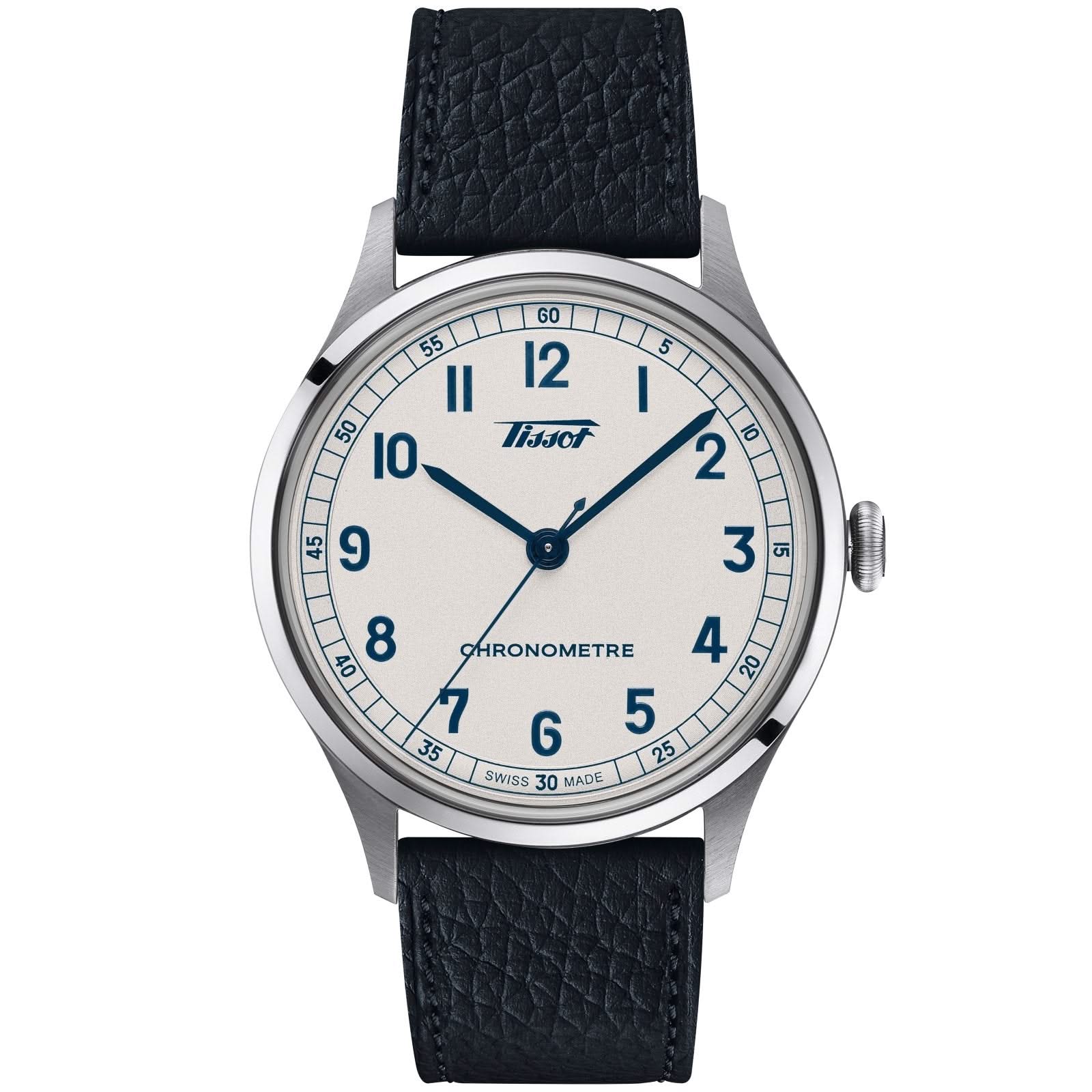Stainless steel Tissot Heritage 1938 automatic watch featuring a silver arabic dial with a stainless steel bezel and case. The watch case is 39mm and is attached to a blue leather strap.