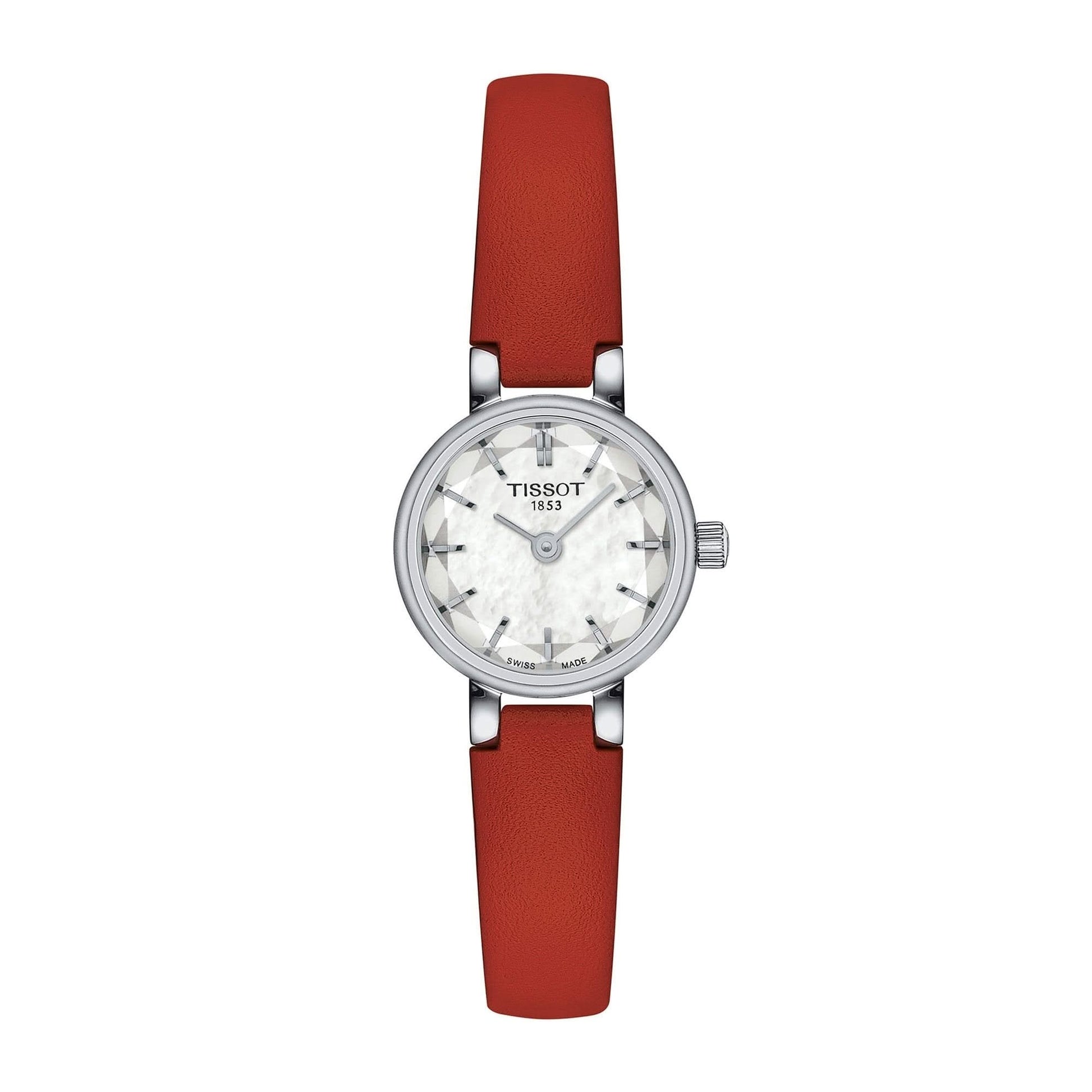 Tissot stainless steel Lovely 19.5mm quartz watch with a mother of pearl index dial and a red leather strap.