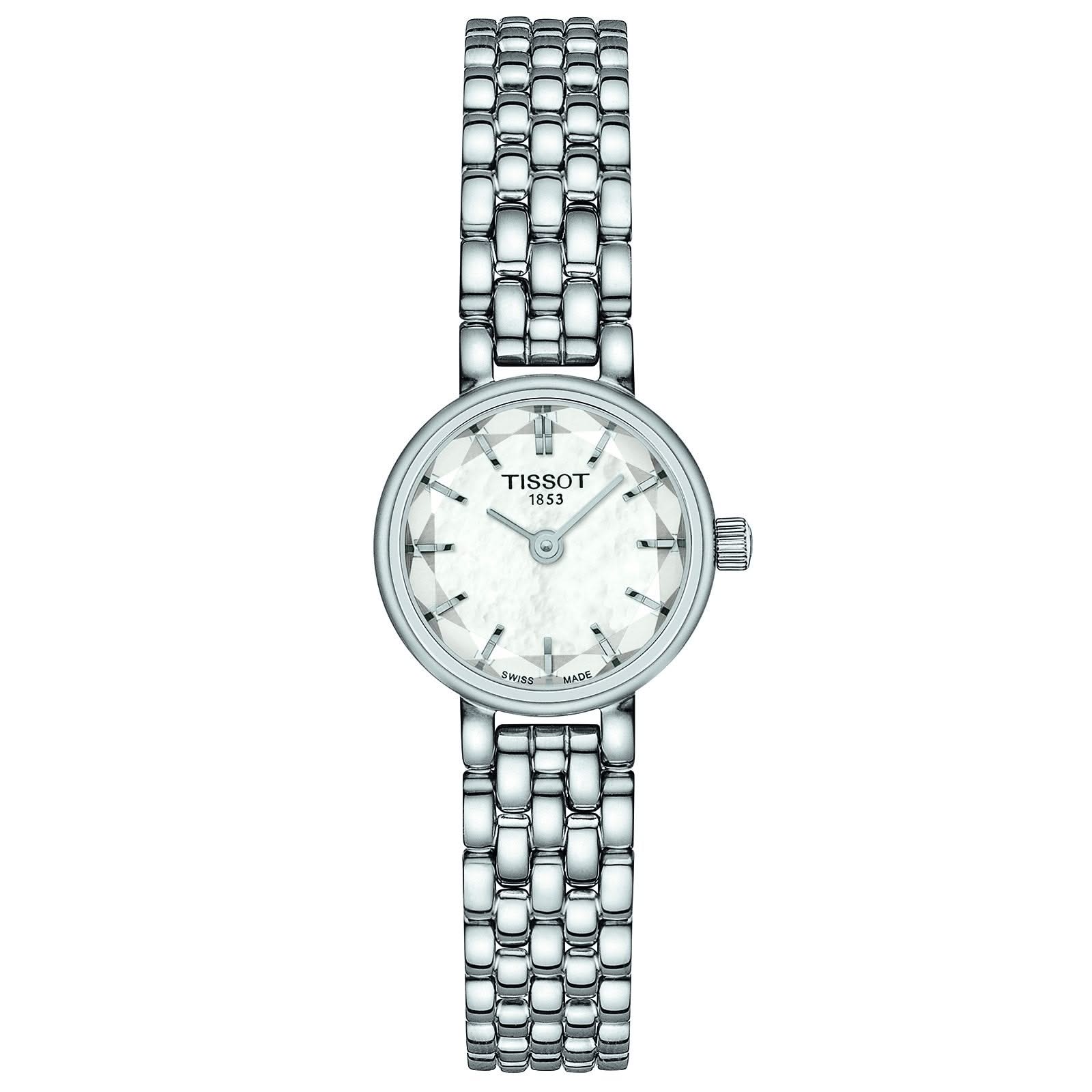 Stainless steel Tissot Lovely quartz watch featuring a white mother-of-pearl index dial with a stainless steel bezel and case. The watch case is 20mm and is attached to a stainless steel bracelet.