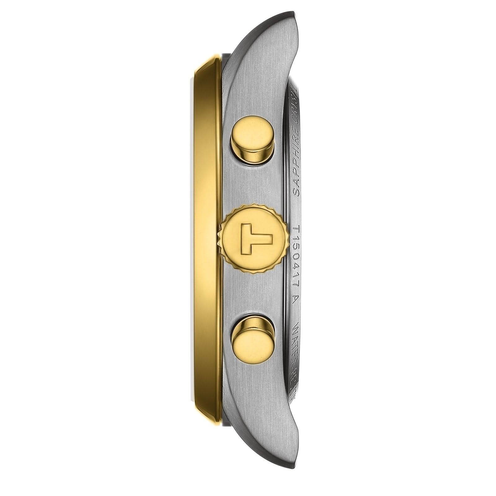 Stainless steel and yellow gold PVD Tissot PR100 chronograph quartz watch featuring a silver index date dial with a yellow gold PVD bezel and a stainless steel case. The watch case is 40mm and is attached to a stainless steel and yellow gold PVD bracelet.