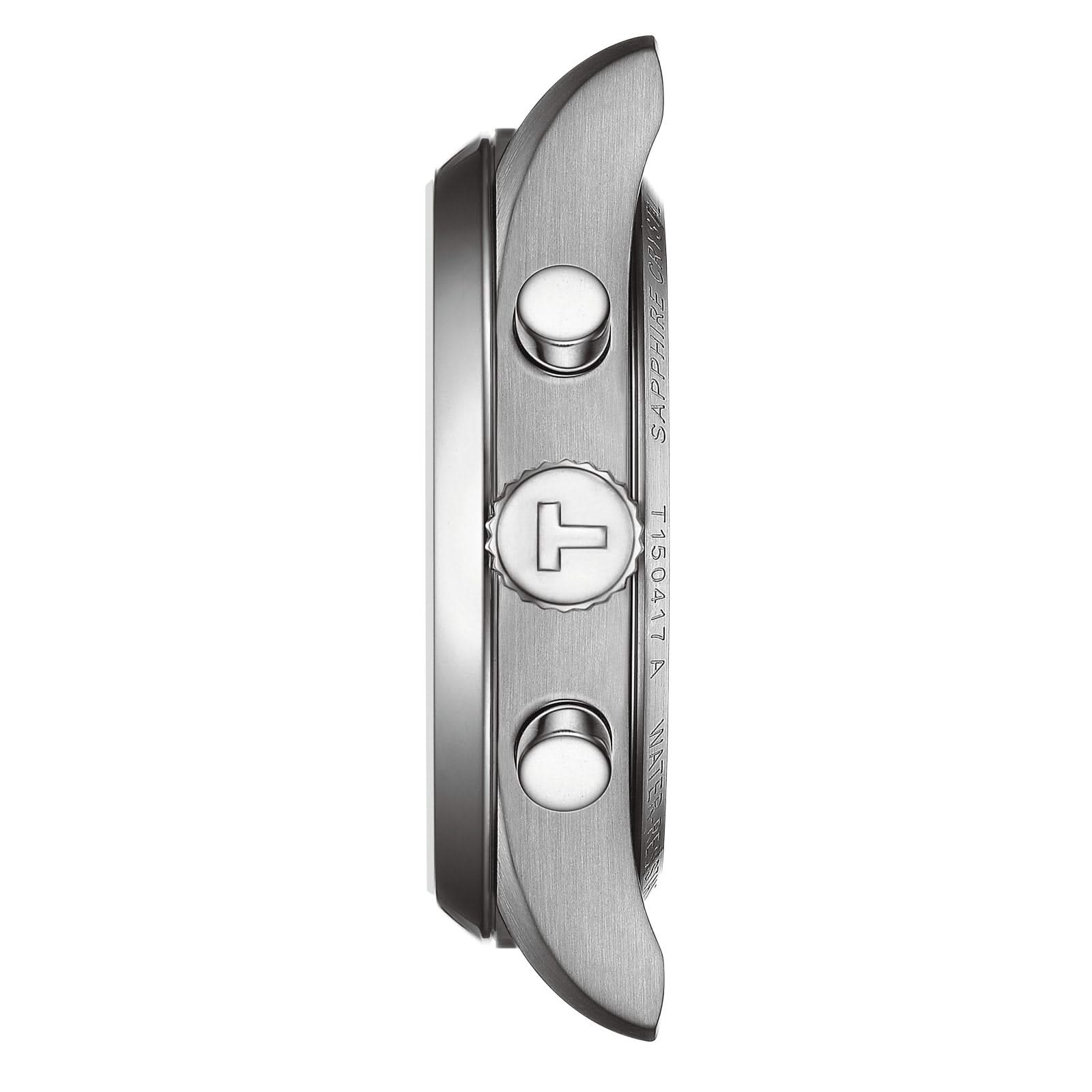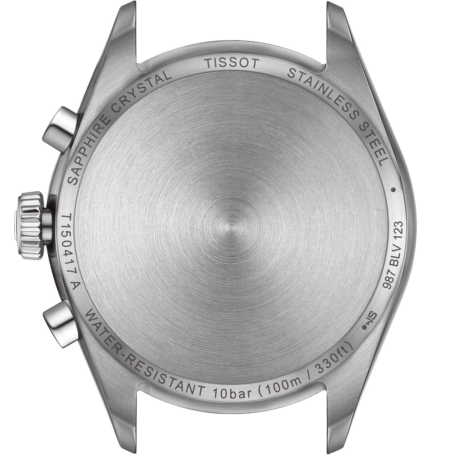 Stainless steel Tissot PR100 Chronograph quartz watch featuring a blue index date dial with blue subdials and a stainless steel bezel and case. The watch case is 40mm and is attached to a stainless steel bracelet.