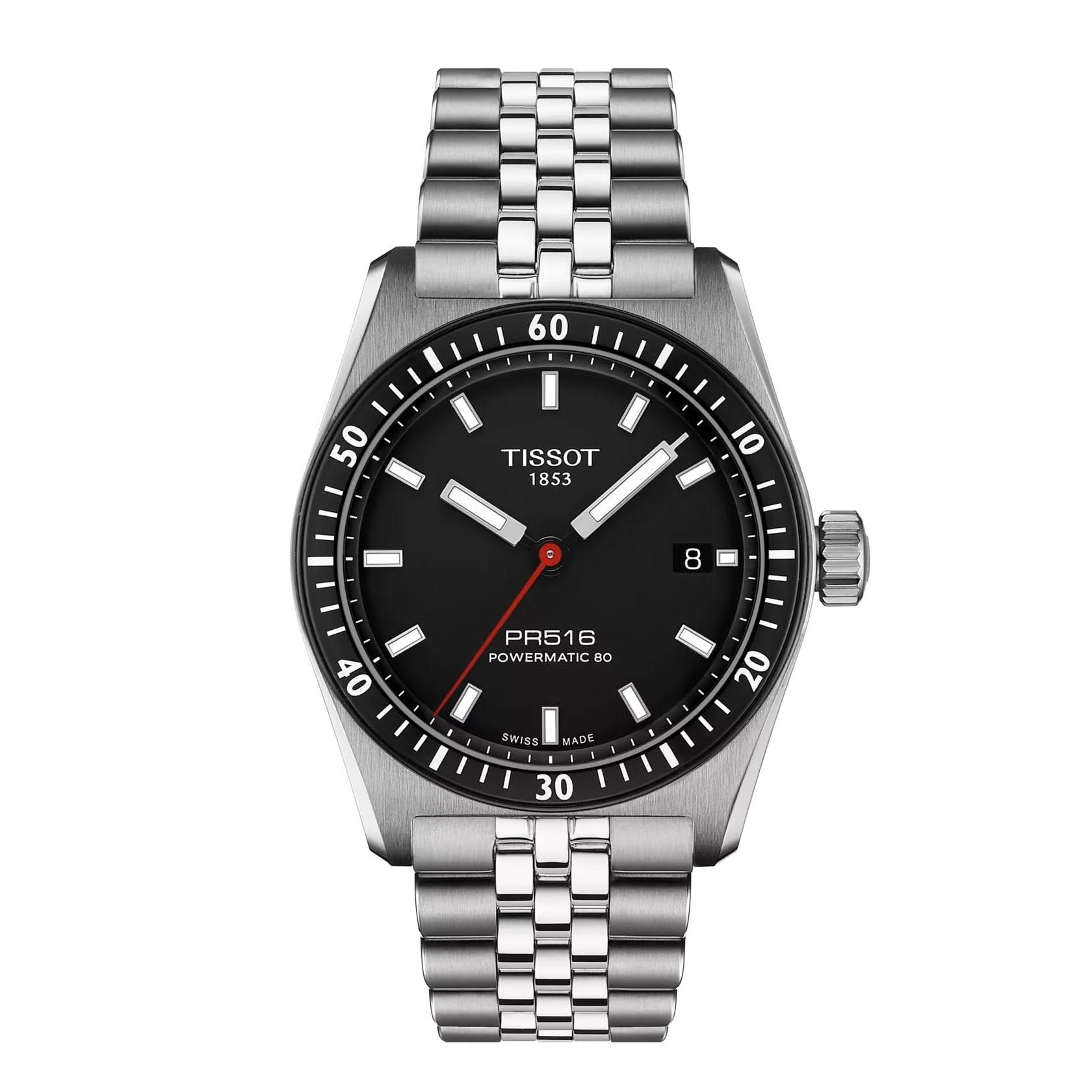 Stainless steel Tissot PR516 automatic watch featuring a black index date dial with a black bezel and a stainless steel case. The watch case is 38mm and is attached to a stainless steel bracelet.