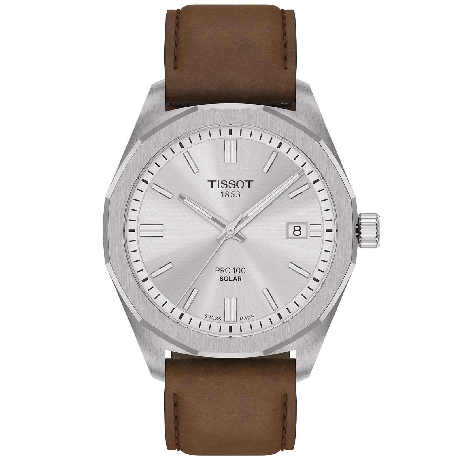 Stainless steel Tissot PRC 100 Solar quartz watch featuring a silver index date dial with a stainless steel bezel and case. The watch case is 39mm and is attached to a brown leather strap.