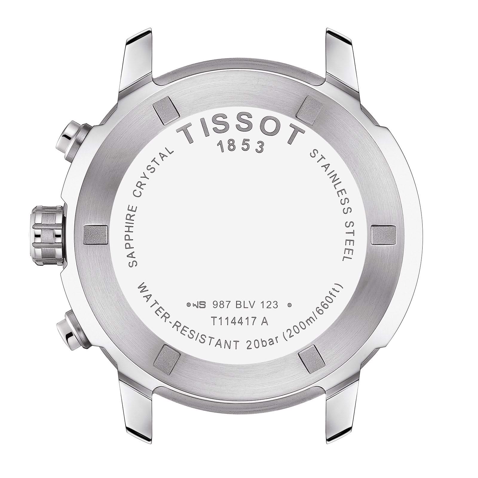 Stainless steel Tissot PRC200 chronograph quartz watch featuring a black arabic/index date dial with black subdials and a high polished bezel and case. The watch case is 42mm and is attached to a stainless steel bracelet.