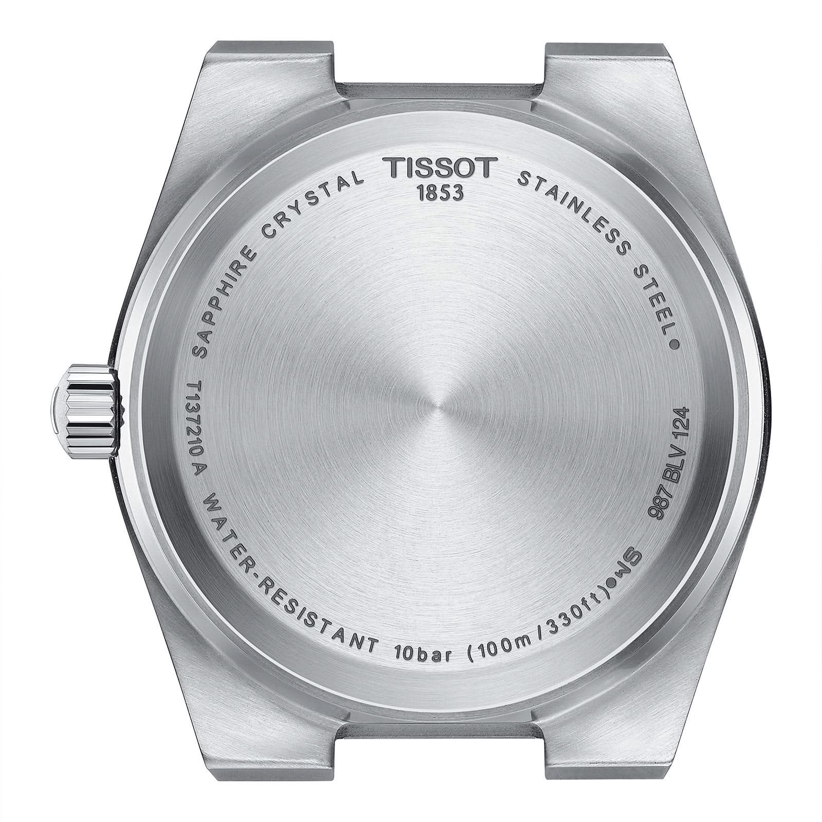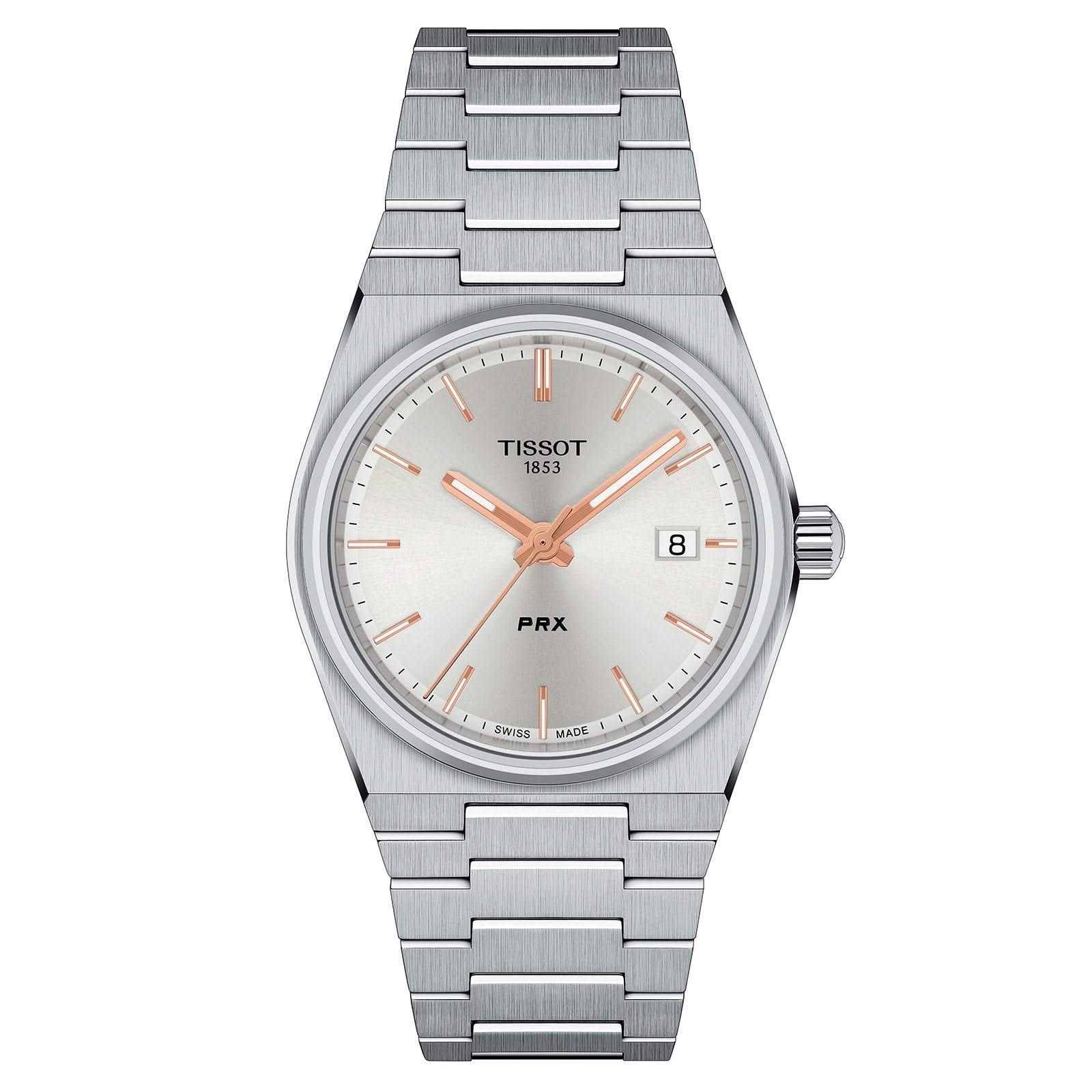 Stainless steel Tissot PRX quartz watch featuring a silver index date dial with a stainless steel bezel and case. The watch case is 35mm and is attached to a stainless steel bracelet.