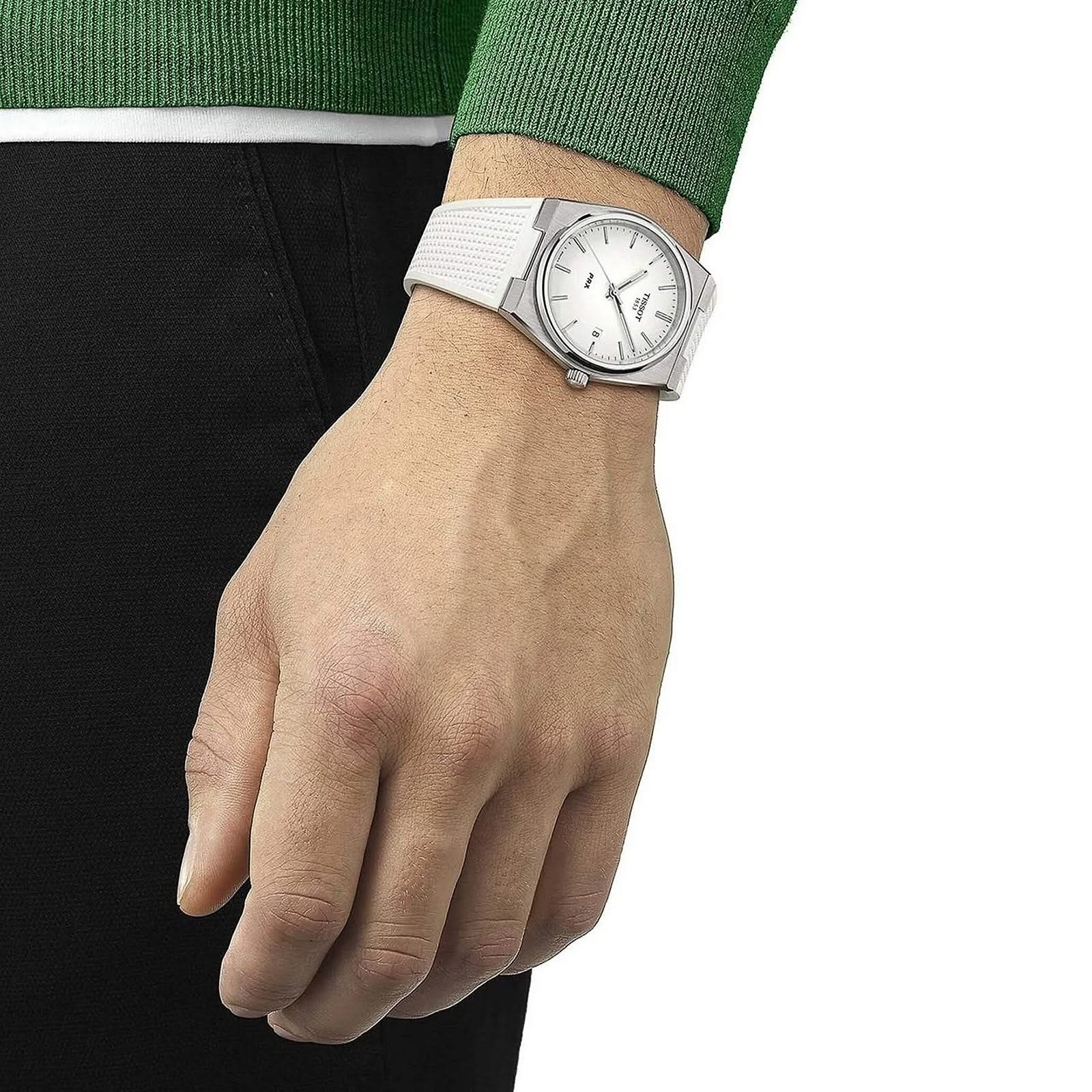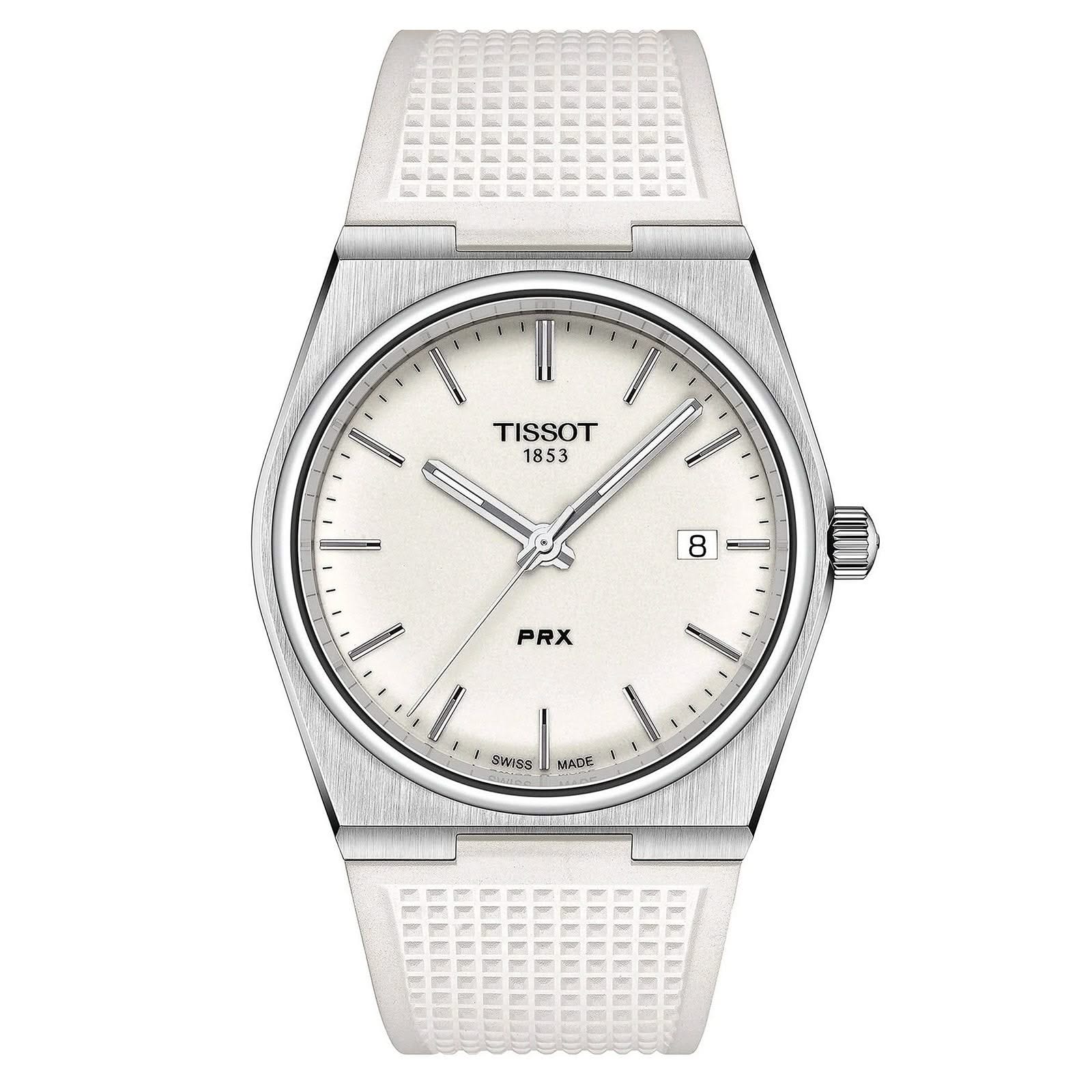 Stainless steel Tissot PRX Quartz watch featuring a white index date dial with a stainless steel bezel and case. The watch case is 40mm and is attached to a white rubber strap.