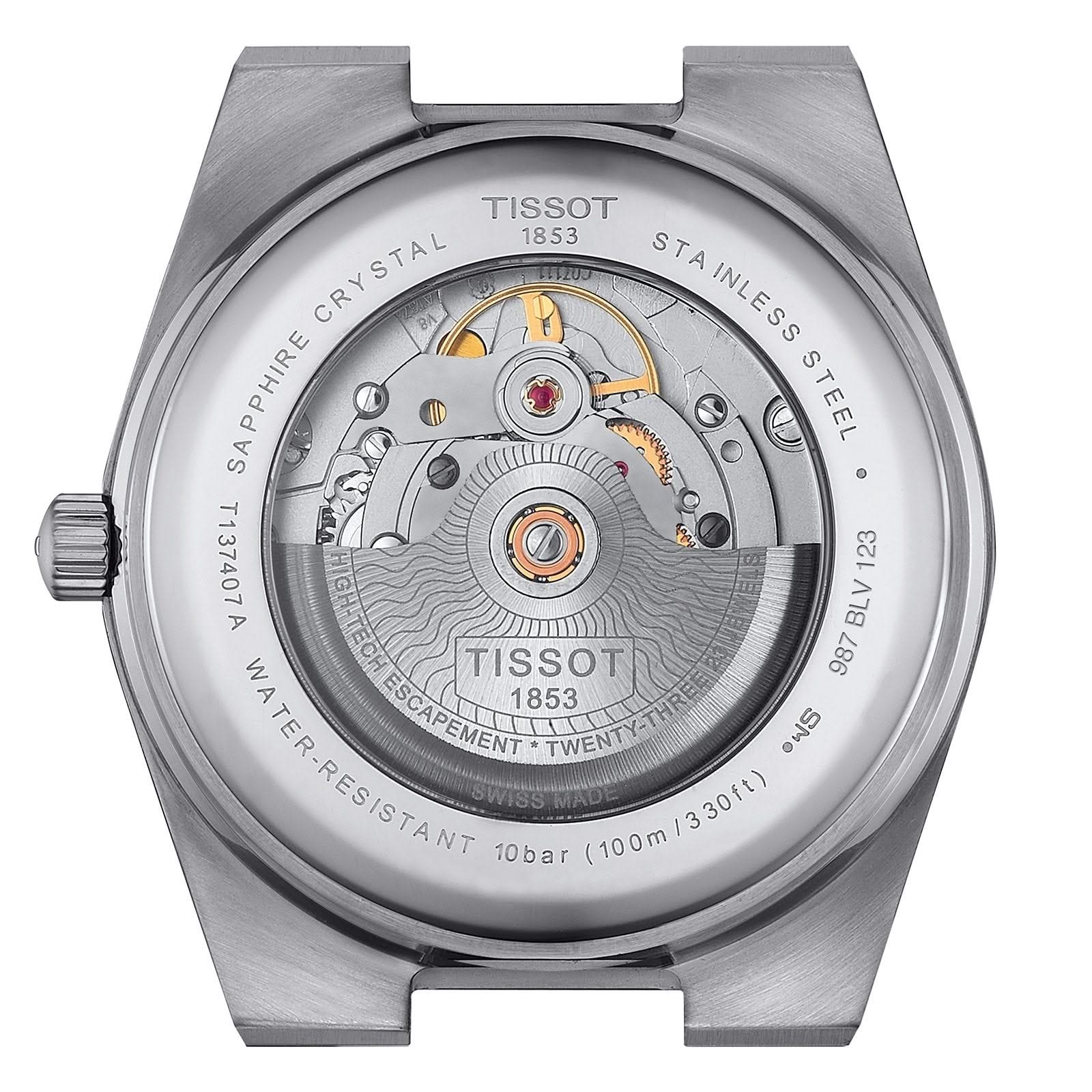 Stainless steel Tissot PRX automatic watch featuring a black index date dial with a stainless steel bezel and case. The watch case is 40mm and is attached to a black rubber strap.