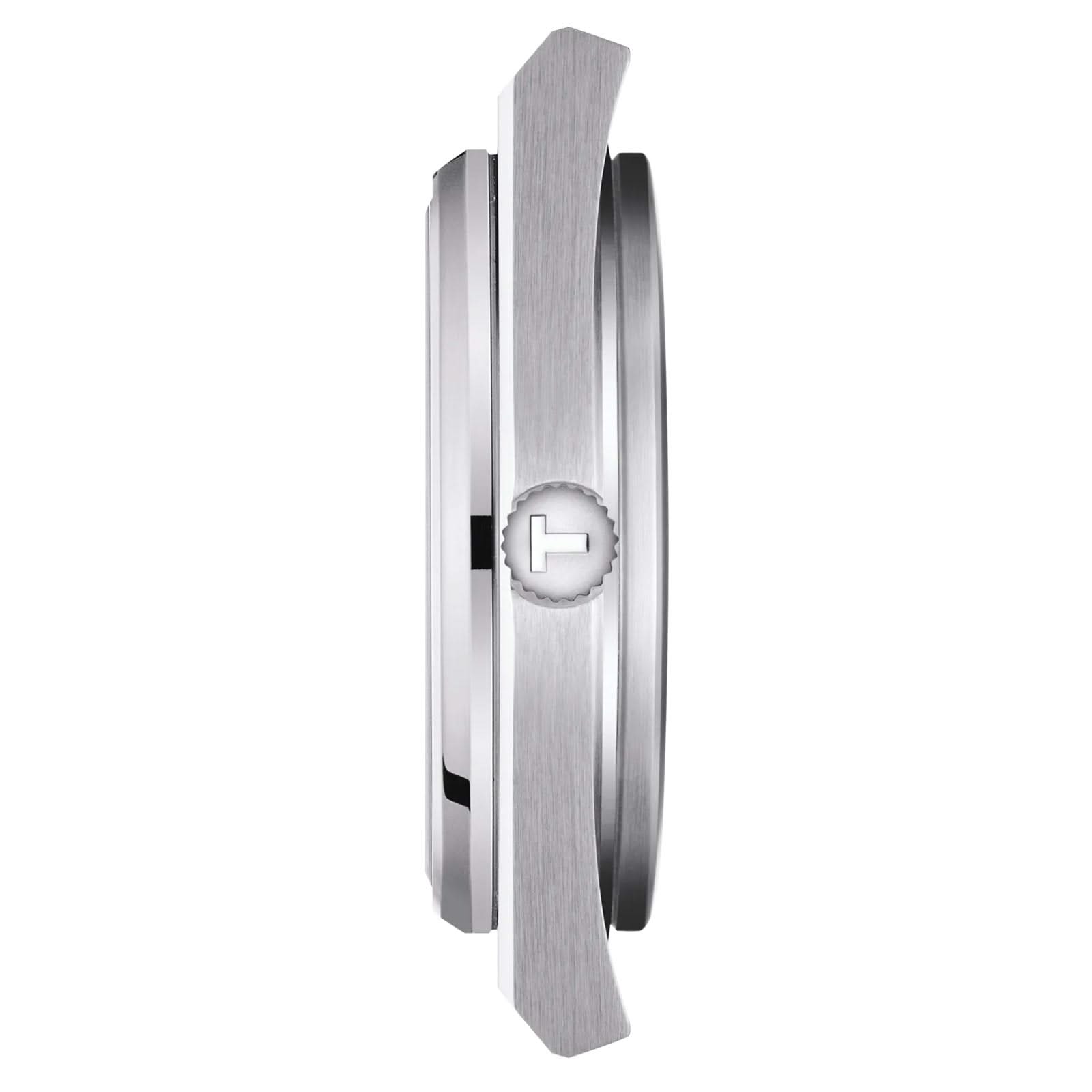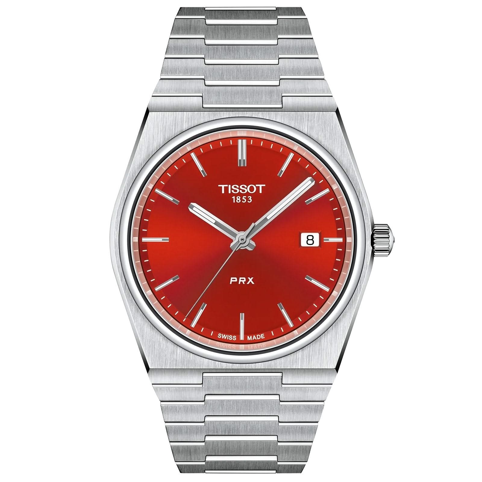 Stainless steel Tissot PRX quartz watch featuring a red index date dial with a stainless steel bezel and case. The watch case is 40mm and is attached to a stainless steel bracelet. Model number T1374101142100.