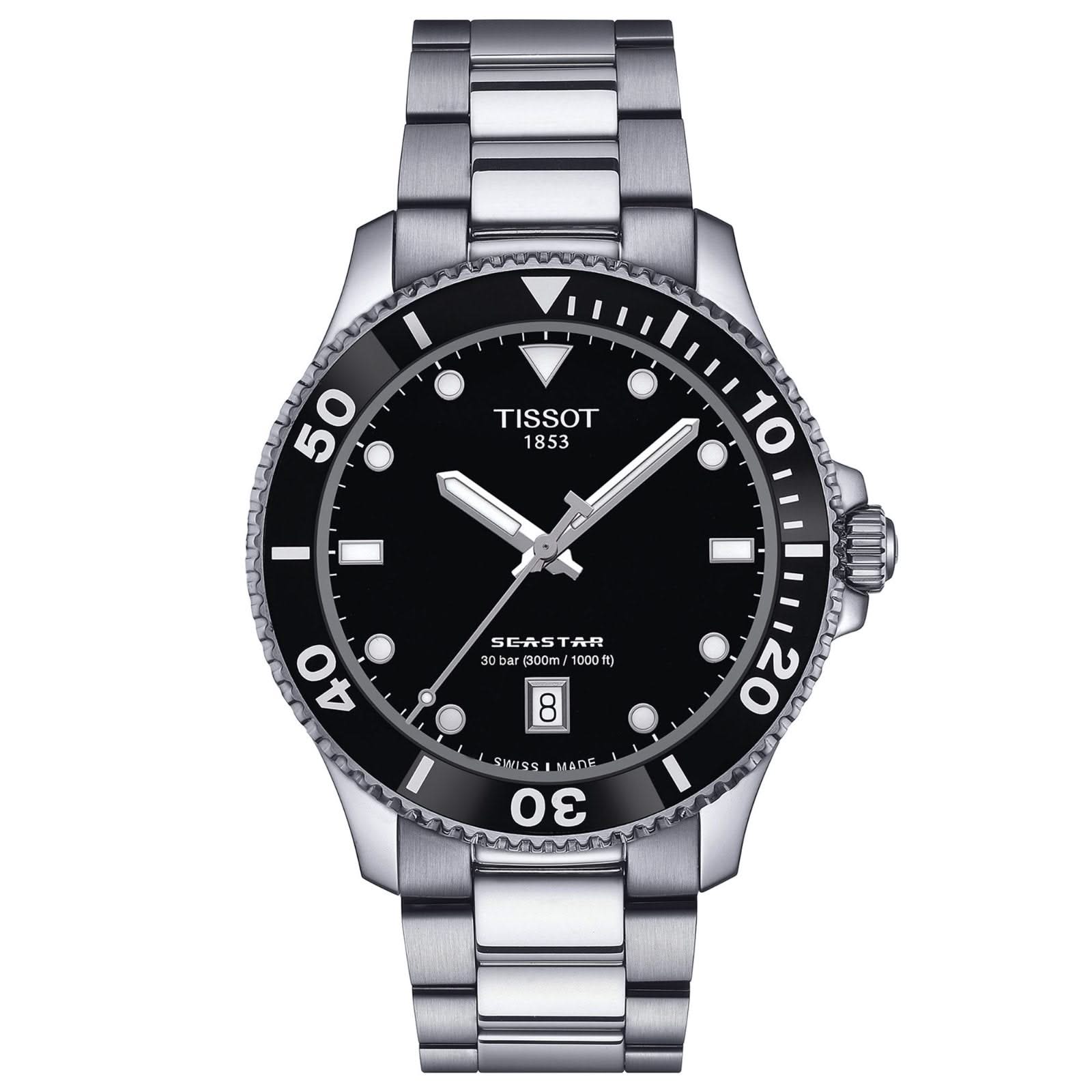 Stainless steel Tissot Seastar1000 quartz watch featuring a black index date dial with black ceramic bezel and a stainless steel case. The watch case is 40mm and is attached to a stainless steel bracelet.