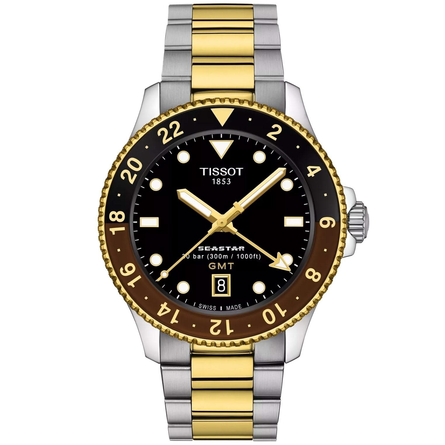 Stainless steel and yellow gold PVD Tissot Seastar 1000 GMT quartz watch featuring a black index date dial with a yellow gold PVD black/ brown numbered bezel and a stainless steel case. The watch case is 40mm and is attached to a stainless steel and yellow gold PVD bracelet.