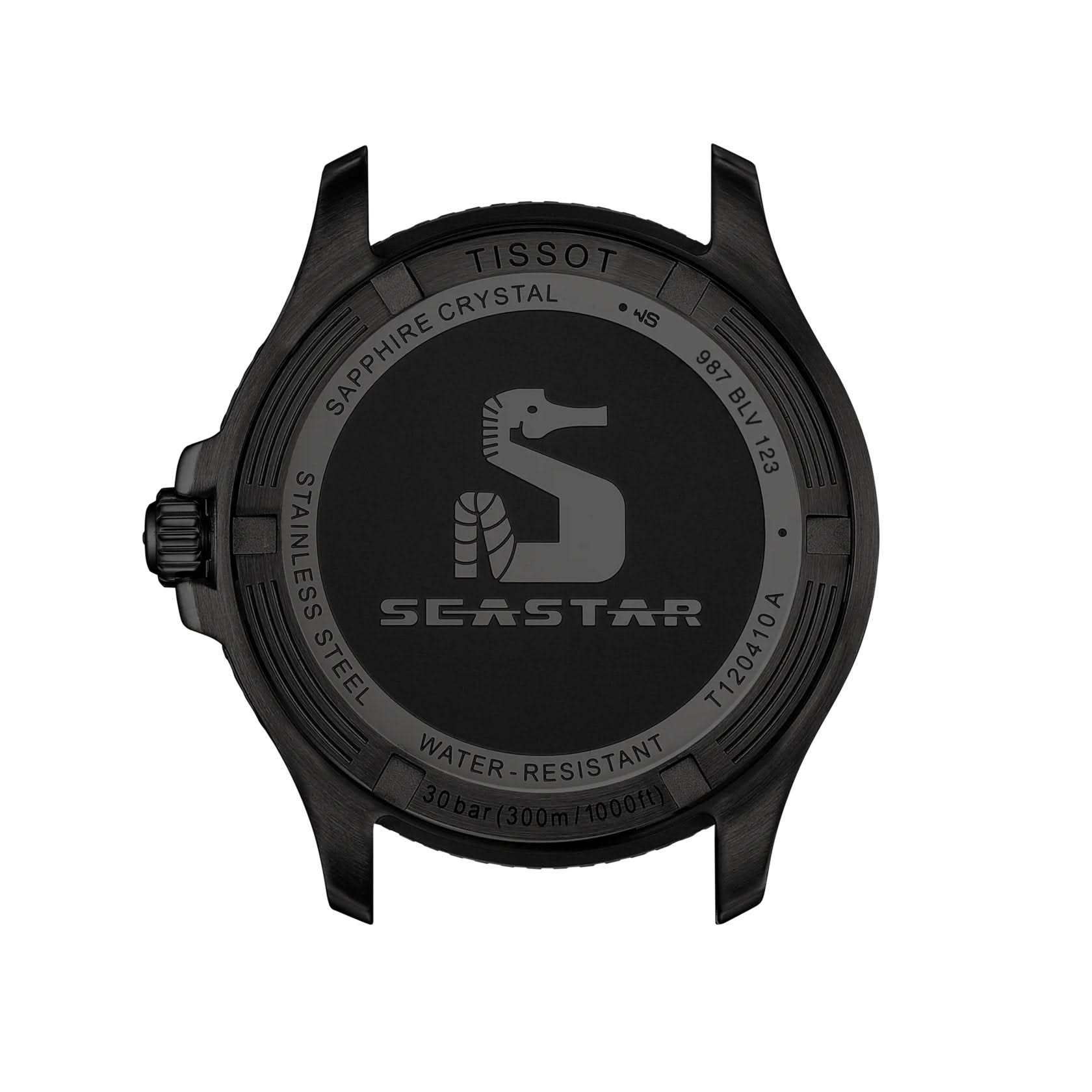 Stainless steel and black PVD Tissot Seastar quartz watch featuring a graduated green index date dial and a black PVD numbered bezel and case. The watch case is 40mm and is attached to a black PVD bracelet.