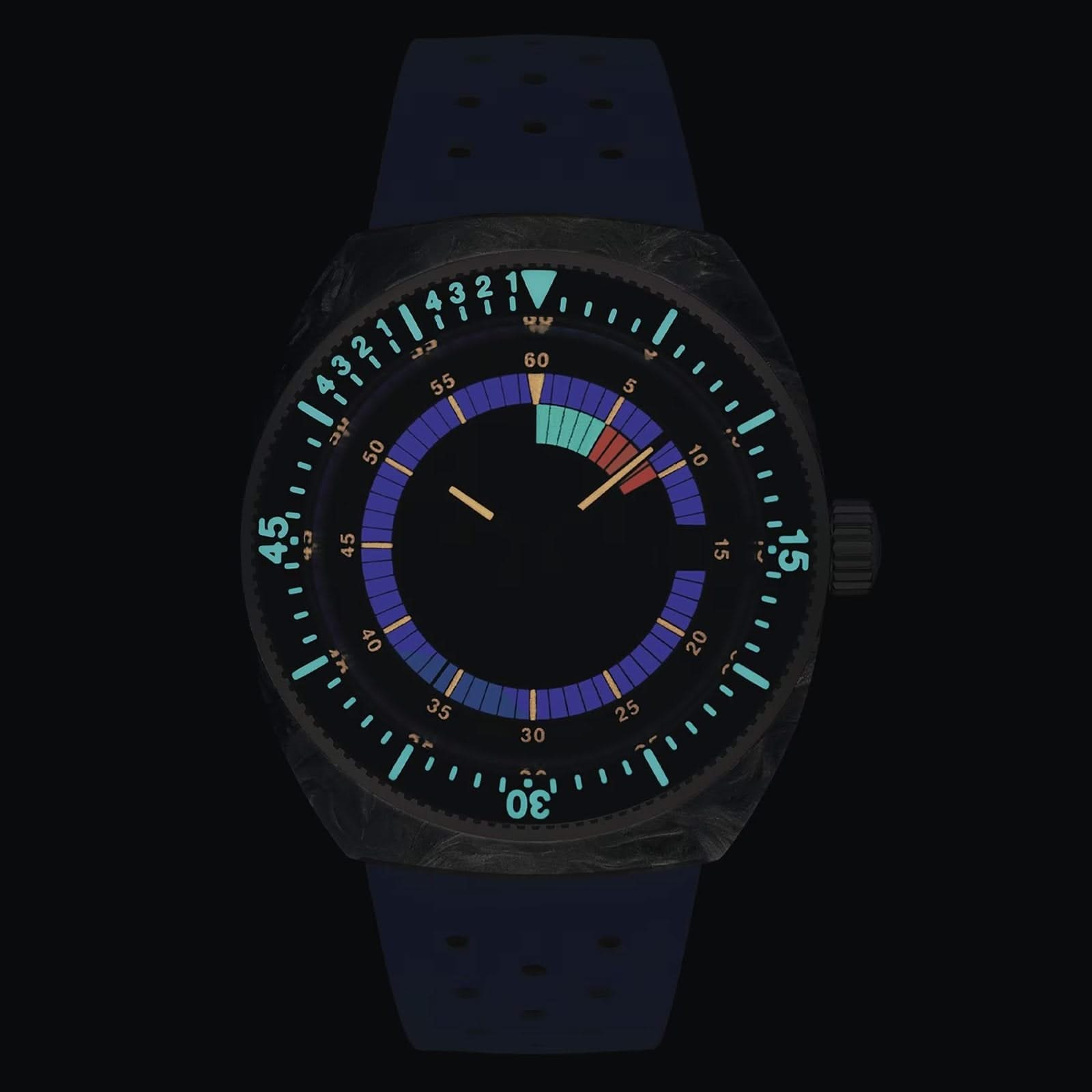 Black/grey marbled stainless steel Tissot Sideral automatic watch featuring a black/blue arabic/index date dial with a black animation bezel and black/grey marbled stainless steel/ carbon case. The watch case is 41mm and is attached to a blue rubber strap.