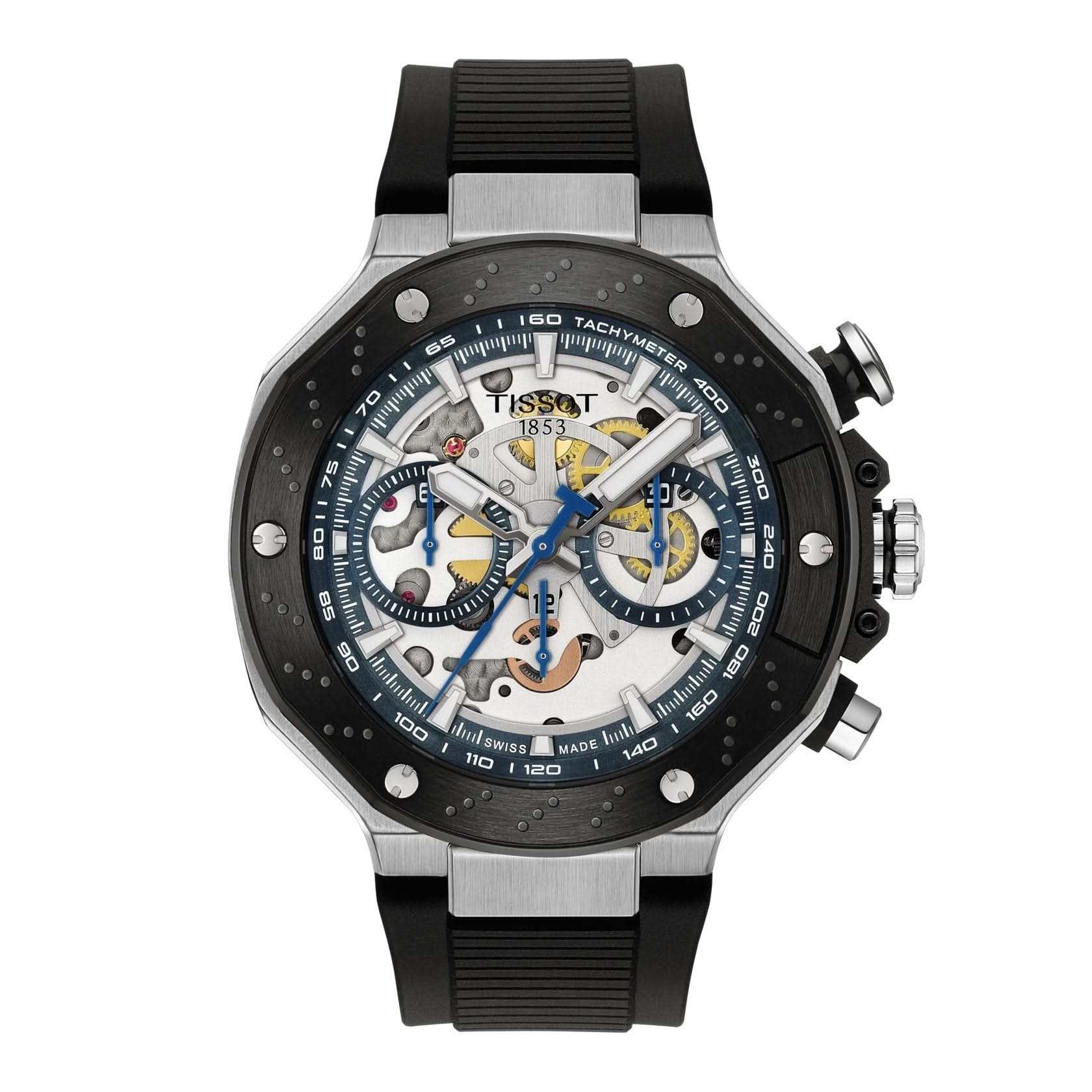 Stainless steel and black PVD coated Tissot T-Race MotoGP chronograph automatic watch featuring a skeleton index dial with a black PVD coated bezel and stainless steel case. The watch case is 45mm and is attached to a black silicone strap. Model number is T1414622704100.